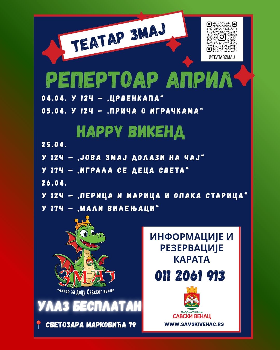 ТЕАТАР ЗМАЈ - РЕПЕРТОАР ЗА АПРИЛ