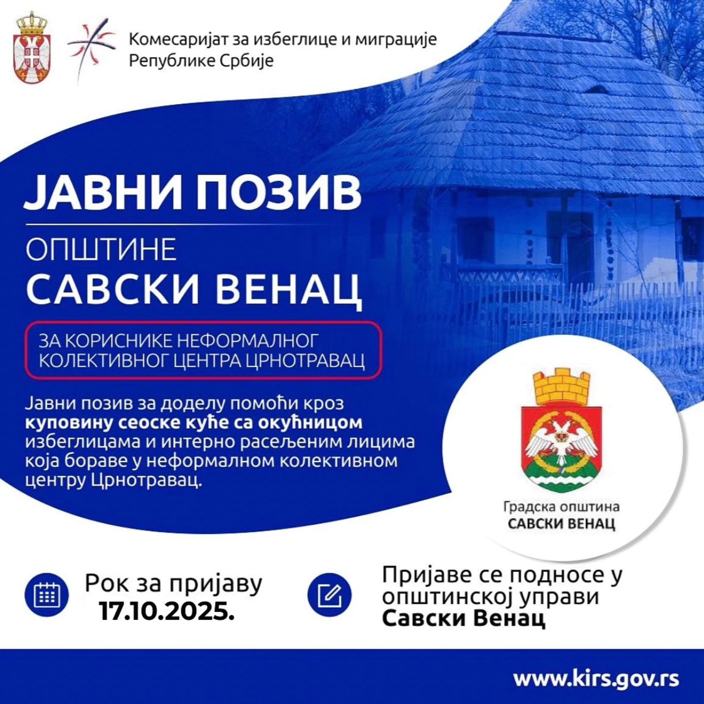 Gradska opština Savski venac raspisala je javni poziv za dodelu pomoći porodicama izbeglica i porodicama interno raseljenih lica dok su u raseljenništvu, a koja žive u neformalnom kolektivnom centru “Crnotravac” za kupovinu seoske kuće sa okućnicom.