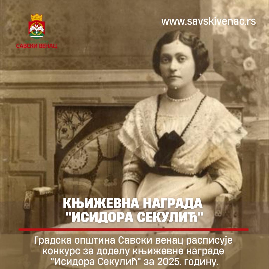 ГРАДСКА ОПШТИНА САВСКИ ВЕНАЦ РАСПИСУЈЕ КОНКУРС ЗА ДОДЕЛУ КЊИЖЕВНЕ НАГРАДЕ „ИСИДОРА СЕКУЛИЋ“ ЗА 2025. ГОДИНУ